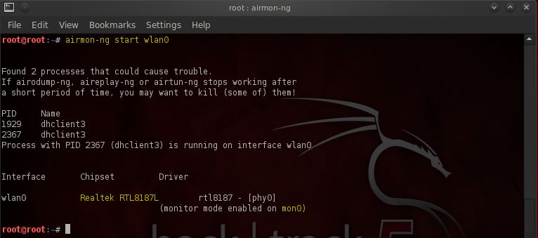 Burada Wireless kartımızın dinleme yapması için bir monitor etkinleştiriyoruz.Wireless chipset modeli ve etkin monitor(mon0) burada görülebilir.