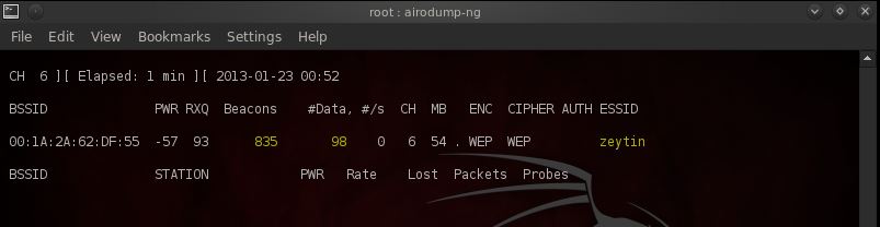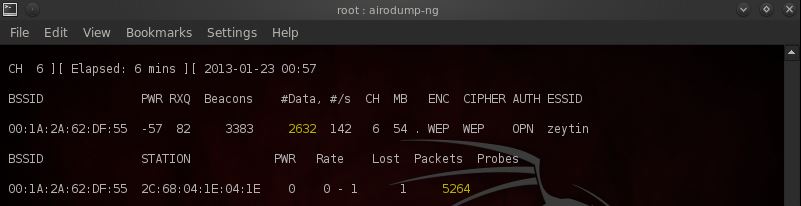 Çevremizde ki ağları bulmak için etkinleştirdiğimiz mon’dan tarama yapıyoruz . Burada ağ isimlerini(ESSID), modem mac adreslerini(BSSID),sinyal güçlerini(PWR) (Sinyal gücü 0’a yakın olan yani mutlak değeri küçük olan cihaz bize en yakın olandır) , hangi kanaldan yayın yaptıkları(CHANNEL) ve şifreleme tekniklerini(ENC) görmek mümkün. Burada ki kurbanımız; ‘zeytin’ adlı WEP şifreleme tekniği kullanan bir modem. CTRL+C tuşu ile taramayı durdurarak bütün kanallardan tarama yapmasını kapatmamız lazım. Çünkü; saldıracağımız modeme tek bir kanal üzerinden dinleme yapacağımız için daha hızlı sonuç almamızı sağlayacak.