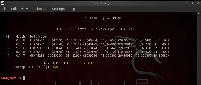 Toplanılan paketlerde şifre denemesini yukarıda görebilirsiniz. Eğer toplanılan paketler yetersiz ise biraz bekleme yapacak ve kendisi otomatik denemeye devam edecektir. Eğer şifre toplanılan paketlerden elde edilmiş ise ;