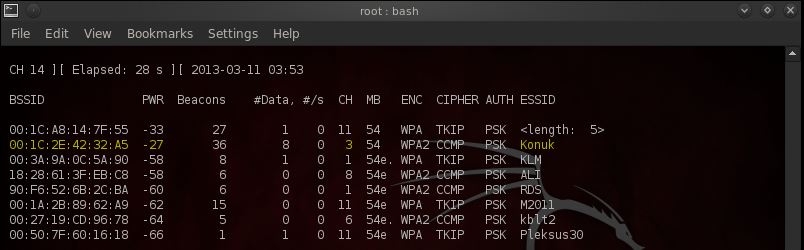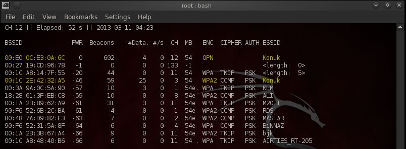 Buradan hedef alınacak ağ seçiliyor. Mesafe olarak yakın bir ağı seçmek işimizi kolaylaştırabilir. Bu nedenle benim hedef alacağım kurbanın SSID’si “Konuk”.