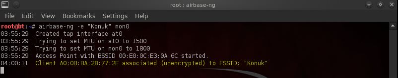 Bir access-point oluşturarak aynı isimde yayın yapmaya başlıyoruz.Yeniden airodump-ng mon0 komutunu çalıştırdıktan sonra ki tablo;