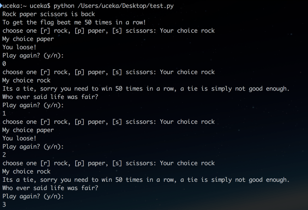 self.request.sendall("Its a tie, sorry you need to win 50 times in a row, a tie is simply not good enough.\nWho ever said life was fair?\n")