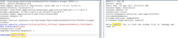 Firstly, we need to check template injection vulnerability with test{{5*5}} ;