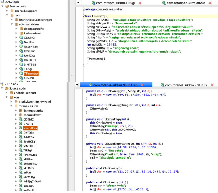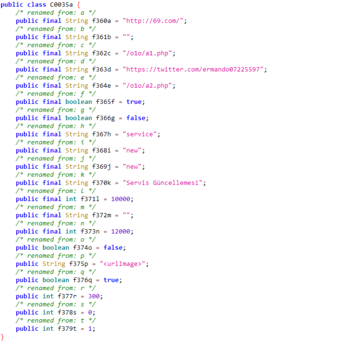 Uygulamanın kaynak kodlarına baktığımızda kodların obfuscate(karmaşıklaştırma) edilmiş olduğunu görmekteyiz: